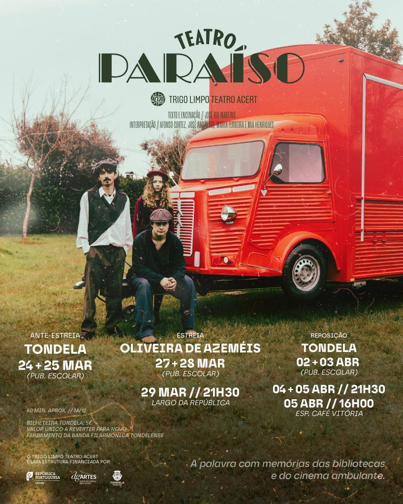 Teatro Paraíso é a nova criação da Associação Cultural e Recreativa de Tondela (ACERT). O espetáculo estreia dia 27 de março, Dia Mundial do Teatro, em Oliveira de Azeméis. Esta criação inspira-se na palavra ambulante e têm como referencias o cinema português e as bibliotecas ambulantes.